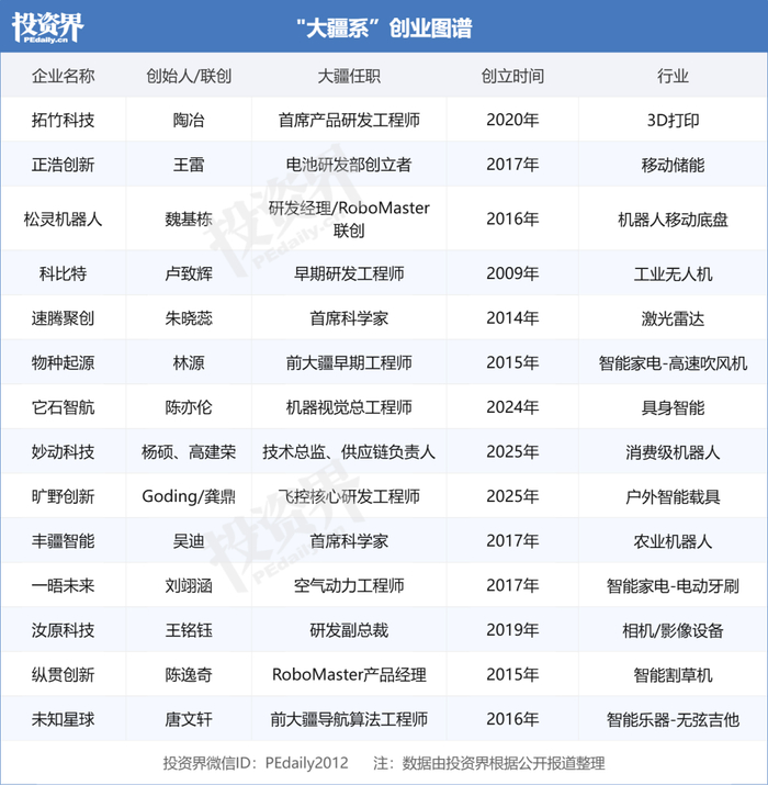 比陶冶早几年,王雷在2017年离开一手建立的大疆电池研发部,成立移动储能公司正浩创新;早王雷一年,大疆高管魏基栋决定去做机器人,松灵机器人成立,今年拿下红杉中国、五源资本、祥峰投资和HKX的亿元融资。更有今年刚成立就拿下红杉中国、经纬创投、美团龙珠融资的妙动科技……这是一串长到让人惊讶的名单。