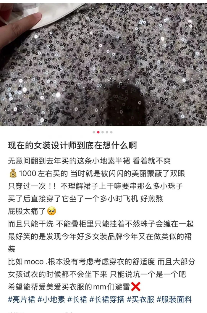 图源:小红书在社交媒体上,也有不少消费者吐槽地素的舒适度太差。有网友表示,自己去年花了1000元买了件当时很火的亮片半身裙,没想到上面的小珠子十分硌屁股。