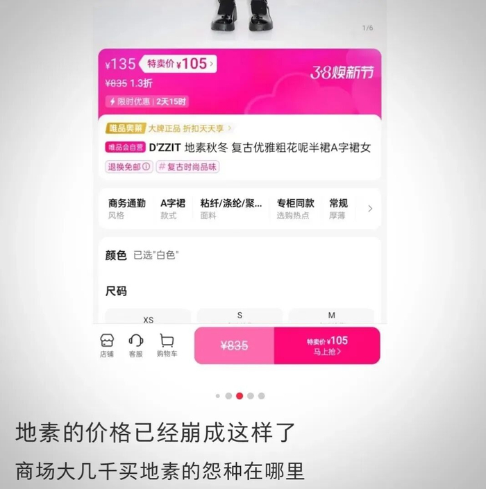 图源:小红书然而,地素的服饰价格在线下一般都在千元左右,在一些电商平台上,地素的一些产品甚至100多元就能买到。这种巨大的价格差,让消费者直呼自己是大冤种。