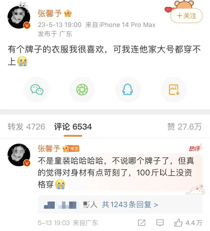 图源:微博就连女明星张馨予也曾吐槽过,现在衣服尺码对身材实在是太苛刻了。女装本身就是用来服务女性的,如今却需要女性去适应它。