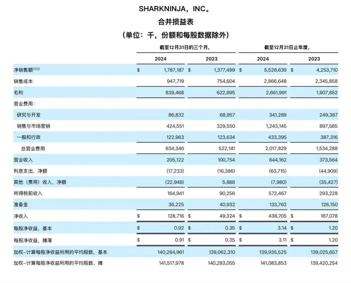 图源:SharkNinja财报回顾2024年,SharkNinja的净销售额就已经达到55.29亿美元,涨幅高达30%,净利润更是同比大涨162.6%至4.387亿美元。