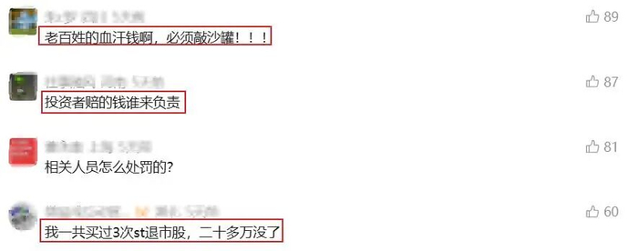 图为网友评论比起造假被重罚,罚款也只是起到警示威慑作用,最终倒霉的还是股民和投资者,他们花真金白银投出去的钱还能追回吗?