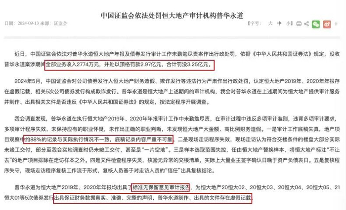 图源:中国证监会还有暴雷的恒大,许皮带丢下一地鸡毛,财务造假更是个天文数字,背后的审计机构普华永道曾获得2774万元的收入,事发后也是被重罚3.25亿元。