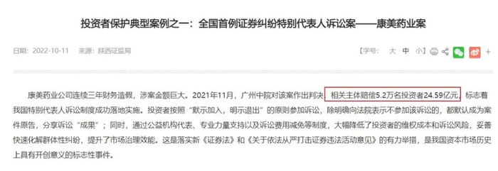 图源:企业公告虽说也有索赔胜利的例子,像同样是连续3年造假的康美药业,法院也开出了全国首例证券纠纷特别代表人诉讼案罚单,判处赔偿5.2万名投资者合计24.59亿元,算下来人均赔偿不到5万元。