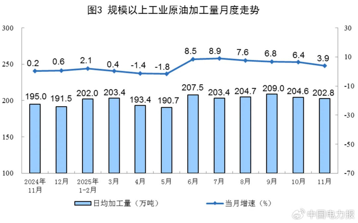 原油加工平稳增长。11月份,规上工业原油加工量6083万吨,同比增长3.9%;日均加工量202.8万吨。
