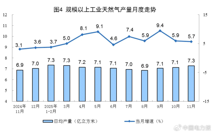 天然气生产稳定增长。11月份,规上工业天然气产量219亿立方米,同比增长5.7%;日均产量7.3亿立方米。