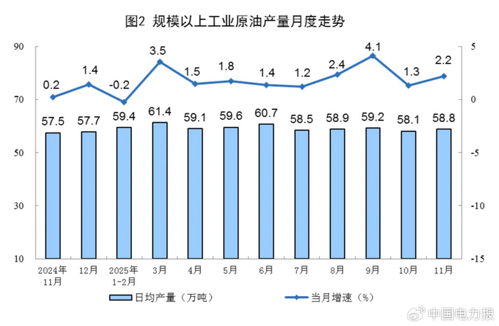 原油生产增速加快。11月份,规上工业原油产量1763万吨,同比增长2.2%,增速比10月份加快0.9个百分点;日均产量58.8万吨。