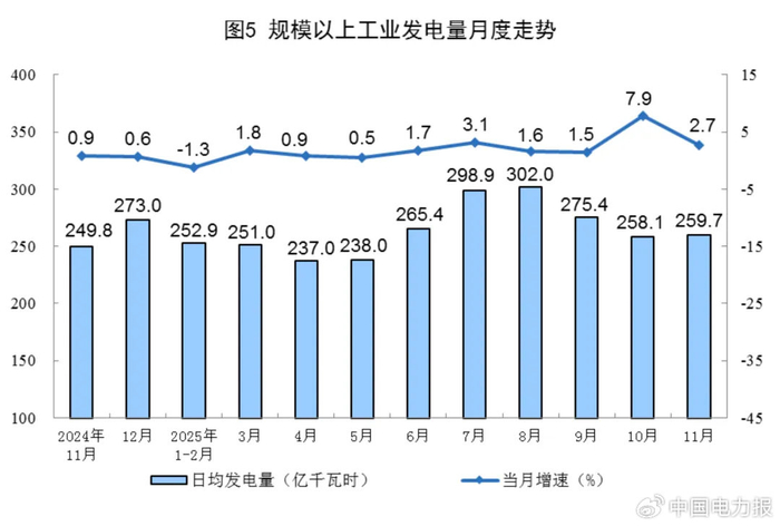 规上工业电力生产保持增长。11月份,规上工业发电量7792亿千瓦时,同比增长2.7%;日均发电量259.7亿千瓦时。1~11月份,规上工业发电量88567亿千瓦时,同比增长2.4%。