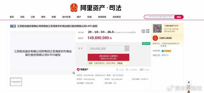 信息显示,江苏阳光股份有限公司(下称 “江苏阳光”)持有的江苏海安农村商业银行股份有限公司(下称 “海安农商行”)4.95%股权,将于2025年12月13日10时起公开拍卖,起拍价1.5亿元,评估价2.14亿元