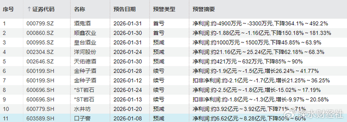 根据Wind数据显示,截至2026年3月5日,口子窖、酒鬼酒、水井坊等9家已发布业绩预告的酒企,业绩集体扑街。