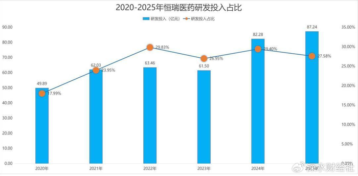 数据显示,从2020-2025年,恒瑞各年包含资本化和费用化的研发投入分别达到49.89亿、62.03亿、63.46亿、61.5亿、82.28亿和87.24亿,六年研发总投入超过406亿!