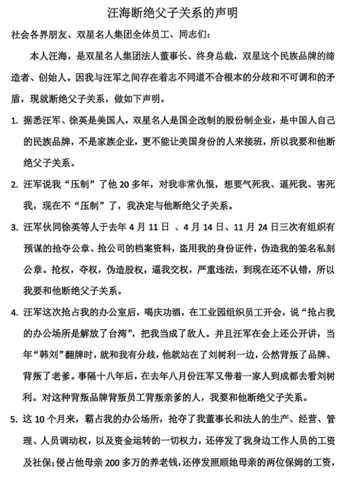 2026年1月3日,汪海发布断绝关系声明,标志着两代人的关系彻底决裂。声明将“接班人国籍”问题置于首位,强调双星名人作为国企改制企业的民族属性,反对美国身份的汪军、徐英接班;同时控诉汪军夺权后推行“去爹化”,宣传中刻意回避品牌缔造者,甚至禁止使用其名下的红蓝双星商标;并直指汪军“自夺权以来经营下滑、人心涣散,工作能力差,不能成为接班人”。 值得关注的是,这场冲突背后是两代人深层的管理理念分歧。