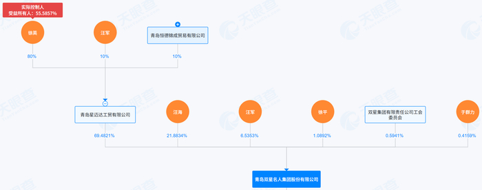 (实际控制人股权结构示意图) (注:受益所有人徐英持股55.5857%,通过青岛星迈达工贸有限公司间接控股双星名人69.4821%;汪海直接持股21.8834%,汪军直接持股6.5353%,其余股权由徐平、双星集团有限责任公司工会委员会等分别持有)