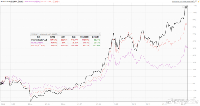 类似的主题还有同样是富国基金管理的创业板人工智能ETF富国(159246,联接A/C:024663/024664),持仓中以CPO和AI软件为主,在2025年的人工智能行情中也表现更好。