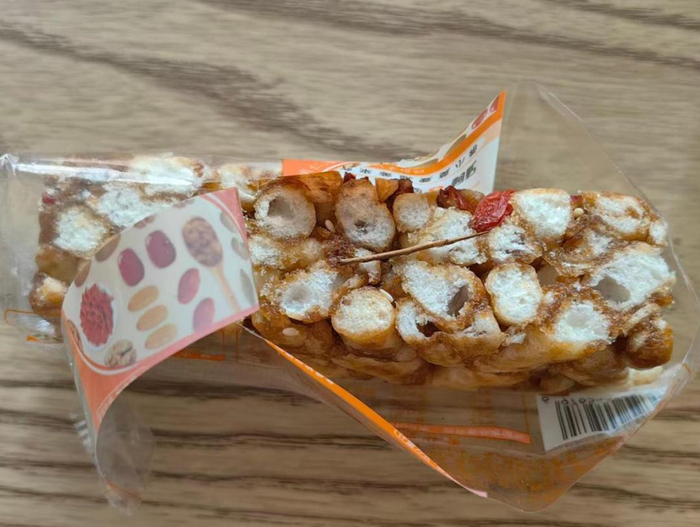 据他描述,该沙琪玛产品于今年11月生产,品牌名为莫小希,配料显示是黑糖+红枣+枸杞。但在他打开包装吃下第一口,就吃出了一根刺状的物品,扎到了牙龈。