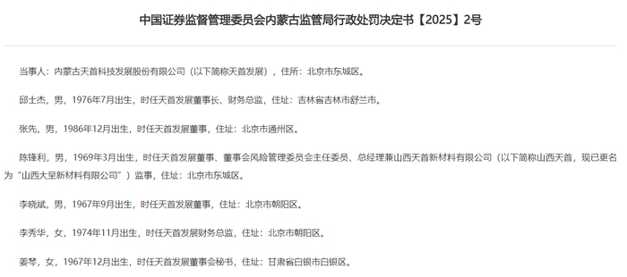 此外,直接责任人天首发展时任董事长兼代财务总监被处以5年市场禁入。