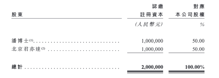 公司初始股权结构中,潘海直接持有50%的股份,另外50%则由潘海与凯因科技联合设立的北京君亦达生物科技有限责任公司(以下简称“北京君亦达”,双方各持股65%、35%)持有。