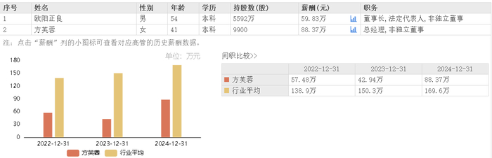 据东方财富网数据,朗特智能总经理方芙蓉2024年所获薪酬为88.37万元,相较上年薪酬42.94万元涨薪105.80%;董事长欧阳正良2024年领薪59.83万元。