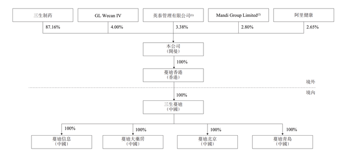 IPO前,蔓迪国际由三生制药持股87.16%,GLWecanIV持股4%,英泰管理有限公司持股3.38%,MandiGroupLimited持股2.8%,阿里健康持股2.65%。