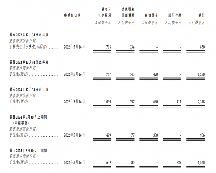 2022年-2024年及2025年上半年,于桉薪酬总计85万元、128万元、231.8万元(包含股份支付41.1万元)及155.8万元(包含股份支付82.9万元)。