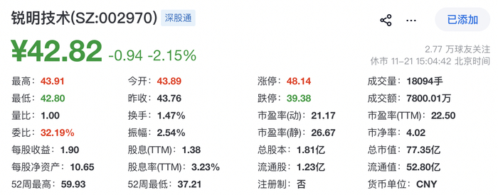 自2019年12月起,公司的A股在深圳证券交易所上市,股票代码为002970。截至发稿时,锐明技术A股报42.82元,总市值约77.35亿元。