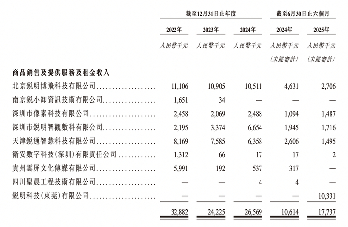另外,锐明技术与多家关联方存在交易。2025年上半年,锐明科技向关联方购买商品及服务发生交易额1538.8万元,来自向关联方商品销售及提供服务及租金的收入为1773.7万元,其中向锐明科技(东莞)有限公司购买商品及服务金额达1493.7万元、销售商品及提供服务金额为1033.1万元。