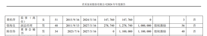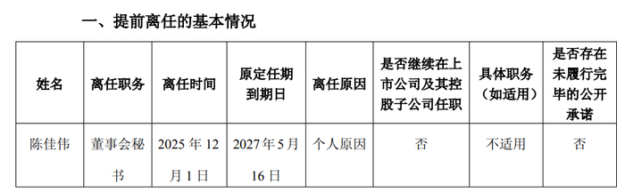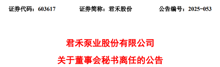 公告显示,君禾泵业股份有限公司董事会近日收到董事会秘书陈佳伟的书面辞职报告。陈佳伟因个人原因,申请辞去公司董事会秘书职务,辞职后不再担任公司任何职务,离任时间为2025年12月1日,其原定任期到期日为2027年5月16日,辞职报告自送达董事会时生效。截至公告日,陈佳伟共持有公司股票82.5万股。
