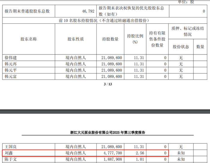 (大元泵业第三季报)大元泵业第三季报显示,刘鑫是该公司第六大股东,持股数量约为477.77万股,持股比例约为2.56%。