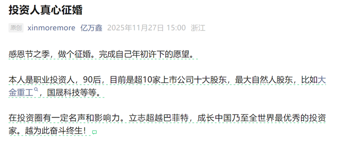 瑞财经 王敏 近日,公众号“亿万鑫”发出一篇文章《投资人真心征婚》。该文章自述称,其是90后职业投资人,目前是超10家上市公司的十大股东之一、最大自然人股东。