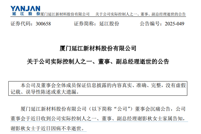 公告显示,厦门延江新材料股份有限公司董事会近日收到公司实际控制人之一、董事、副总经理谢影秋家属告知,谢影秋于近日因病不幸逝世。