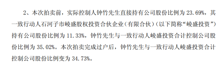 本次拍卖完成过户后,钟竹与一致行动人合计控制公司股份比例将由 35.02%变更为 34.73%。