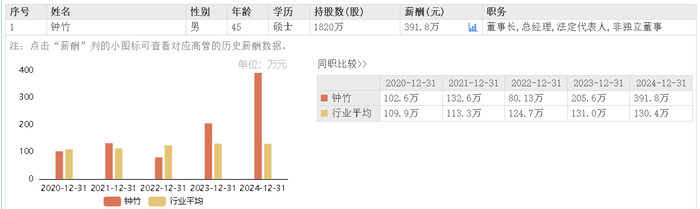据东方财富网数据,钟竹现任安博通董事长兼总经理,2022-2024年分别领薪80.13万、205.6万和391.8万元,近三年涨薪388.96%。