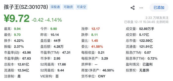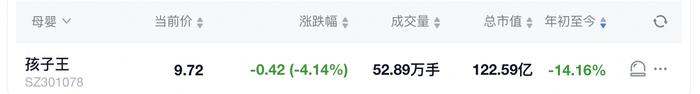 截至发稿时,孩子王A股报9.72元,跌4.14%,总市值约122.59亿元。自年初至今,其股价累计下跌14.16%。