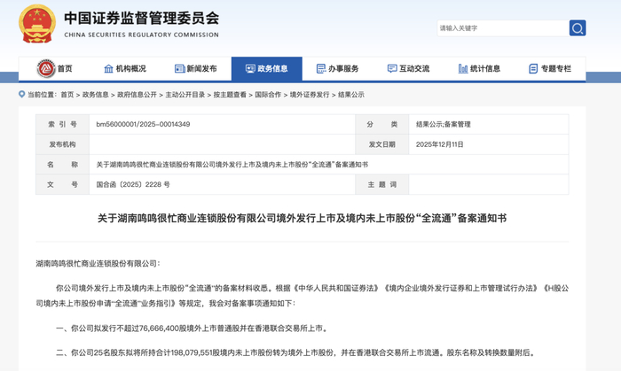 瑞财经 刘治颖 12月11日,中国证监会国际合作司关于湖南鸣鸣很忙商业连锁股份有限公司(以下简称“鸣鸣很忙”)境外发行上市及境内未上市股份“全流通”备案通知书