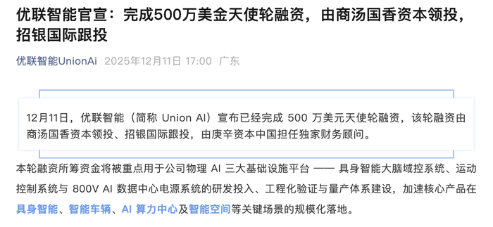 瑞财经 吴文婷 12月11日,优联智能(简称“Union AI”)宣布已经完成500万美元天使轮融资,该轮融资由商汤国香资本领投、招银国际跟投,由庚辛资本中国担任独家财务顾问。