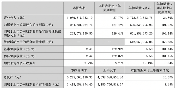 2025年前三季度,公司实现营收为27.73亿元,同比增长24.89%;归母净利润为6.07亿元,同比增长101.27%。