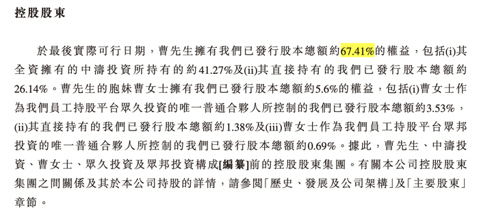 曹马涛的胞妹曹侠淑拥有公司已发行股本总额约5.6%的权益,包括曹侠淑作为员工持股平台众久投资的唯一普通合伙人所控制的公司已发行股本总额约3.53%,其直接持有的公司已发行股本总额约1.38%及曹侠淑作为员工持股平台众邦投资的唯一普通合伙人所控制的公司已发行股本总额约0.69%。