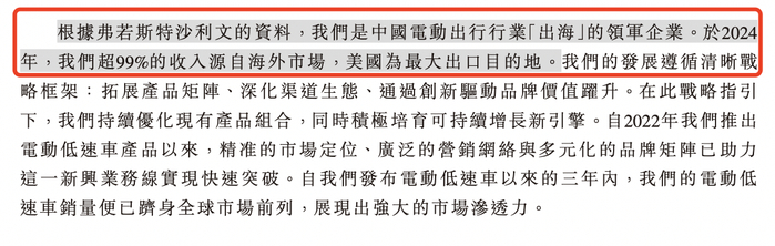 值得一提的是,根据弗若斯特沙利文的资料,涛涛车业是中国电动出行行业“出海”的领军企业。于2024年,公司超99%的收入源自海外市场,美国为最大出口目的地。