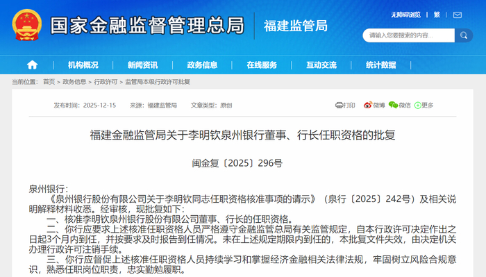 瑞财经 王敏 12月15日,福建金融监管局批复,核准李明钦泉州银行股份有限公司(以下简称“泉州银行”)董事、行长的任职资格。
