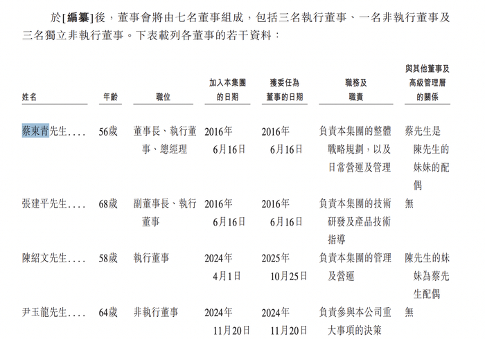 公开资料显示,蔡东青,56岁,为公司的董事长、执行董事兼总经理。蔡东青为集团的联合创办人,自2016年6月起担任公司的董事长兼总经理,并于2025年10月25日获调任为执行董事。其主要负责集团的战略规划、执行、营运及整体管理。