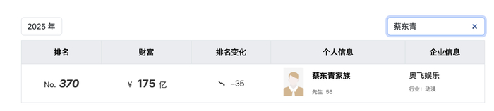 2025年10月,蔡东青家族以175亿元人民币财富,位列《2025年胡润百富榜》第370位。