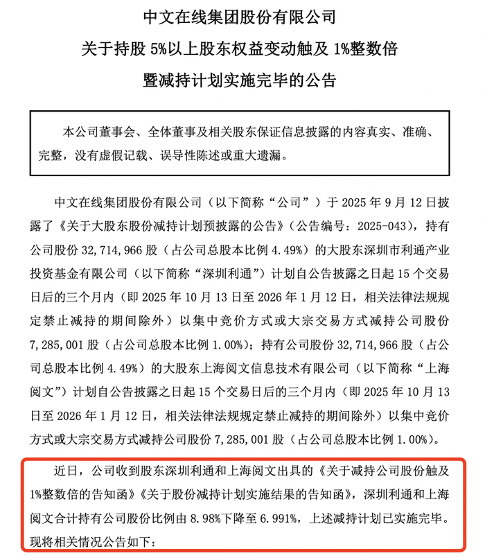 值得注意的是,此前11月4日,中文在线公告称,公司收到股东深圳利通和上海阅文出具的《关于减持公司股份触及1%整数倍的告知函》《关于股份减持计划实施结果的告知函》。
