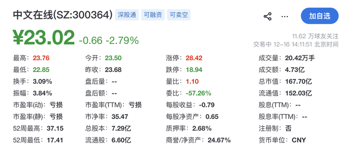 截至发稿时,中文在线A股报23.02元,跌2.79%,总市值约167.7亿元。