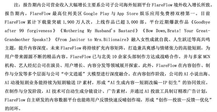 报告期内,FlareFlow最高位列美区Google Play与App Store娱乐应用免费榜双榜第一。目前FlareFlow累计下载量突破1,900万人次,上线作品已超3,000部。平台近期爆款作品《Goodbye after 99 forgiveness》《Mothering My Husband's Bastard》《Bow Down,Brats! Your Great- Grandmother Speaks!》《From Janitor to Mrs.Bilionaire》融入女性成就自我、人生跃迁等高共鸣主题,提升内容深度。