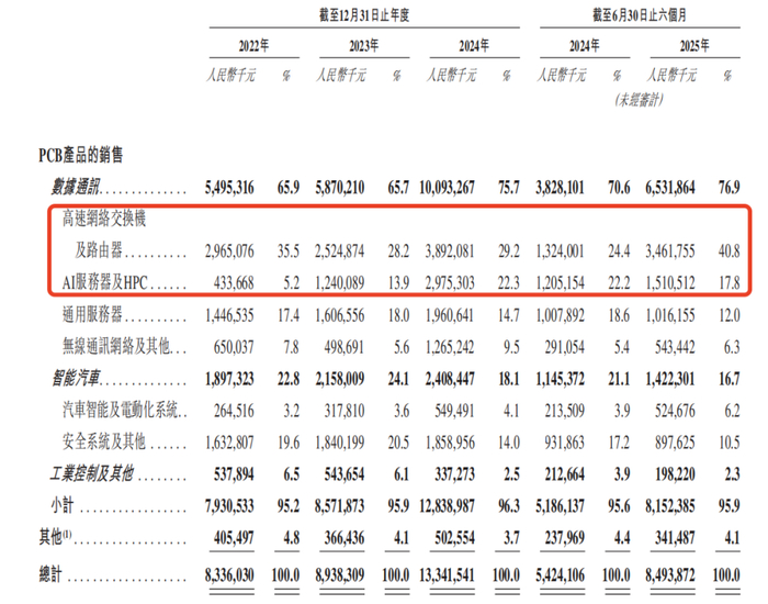 细分来看,数据通讯领域的高速网络交换机及路由器是最核心的业务支柱,收入占比由2022年的35.5%增至2025年上半年的40.8%;其次是AI服务器及HPC,同期收入占比由5.2%增至17.8%。