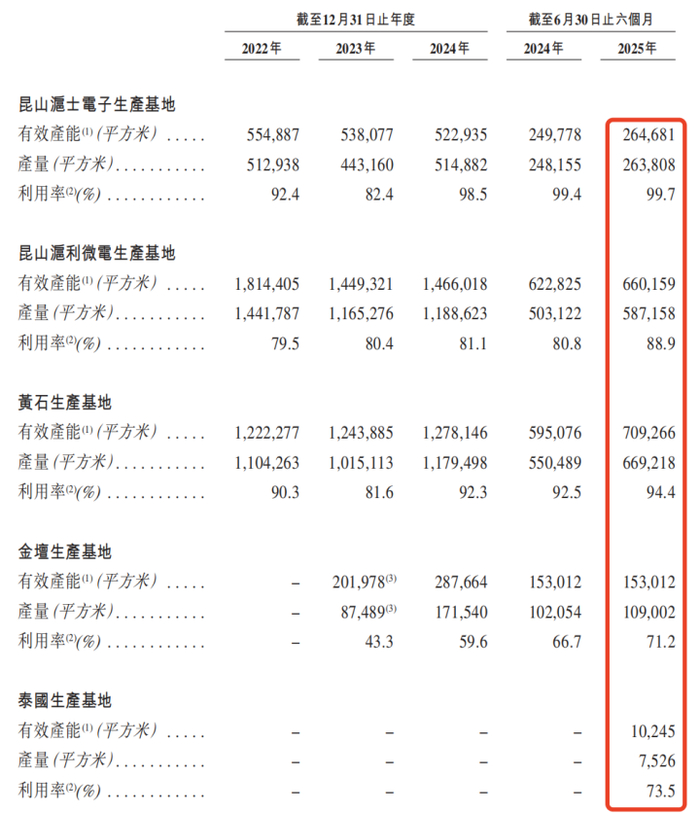 不过,从招股书披露的五大生产基地产能利用率来看,除昆山沪士电子生产基地和黄石基地的产能利用率在2025年上半年基本饱和外,其余生产基地的利用率均不及90%。