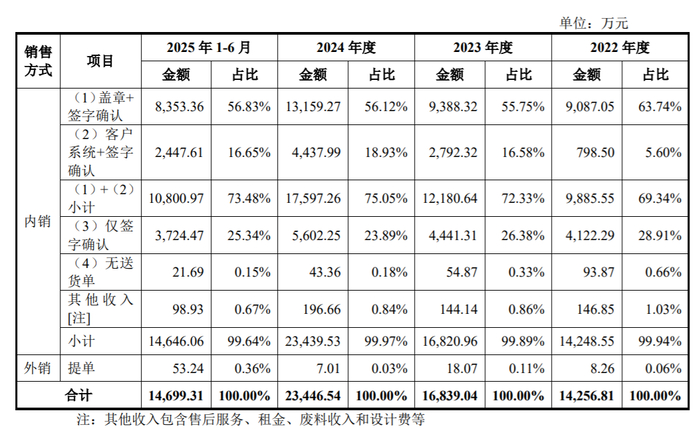 报告期各期,公司送货单仅签字未盖章收入分别为4122.29万元、4441.31万元、5602.25万元和3724.47万元,占当期营业收入比例分别为28.91%、26.38%、23.89%和25.34%。上述客户主要系模具厂和汽车零部件厂。