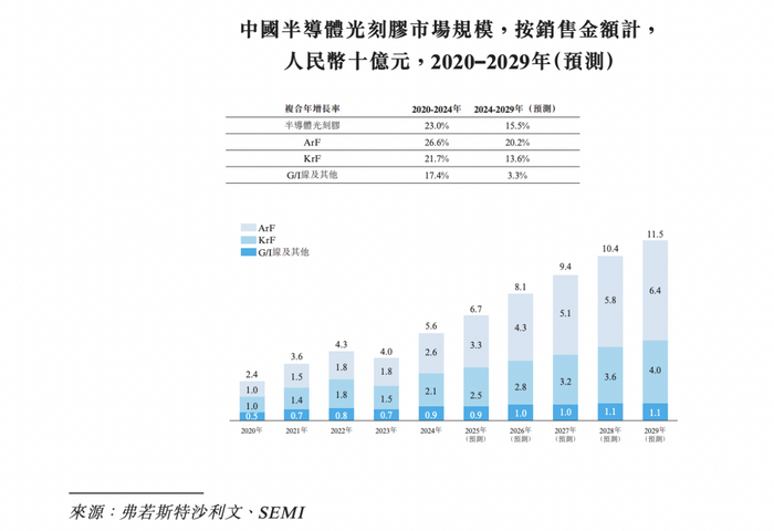 半导体光刻胶是芯片制造关键材料,能将掩模版电路图形精确转移到硅片表面。从中国半导体光刻胶市场的销售金额来看,ArF光刻胶销售金额从2020年的10.0亿元增长至2024年的26.0亿元,复合年增长率为26.6%,预计2029年将达到64.0亿元,期间复合年增长率为20.2%;KrF光刻胶销售金额从2020年的10.0亿元增长至2024年的21.0亿元,复合年增长率为21.7%,预计2029年将达40.0亿元,期间复合年增长率为13.6%;G/I线及其他光刻胶销售金额从2020年的5.0亿元增长至2024年的9.0亿元,复合年增长率为17.4%,预计2029年将达到11.0亿元,期间复合年增长率为3.3%。