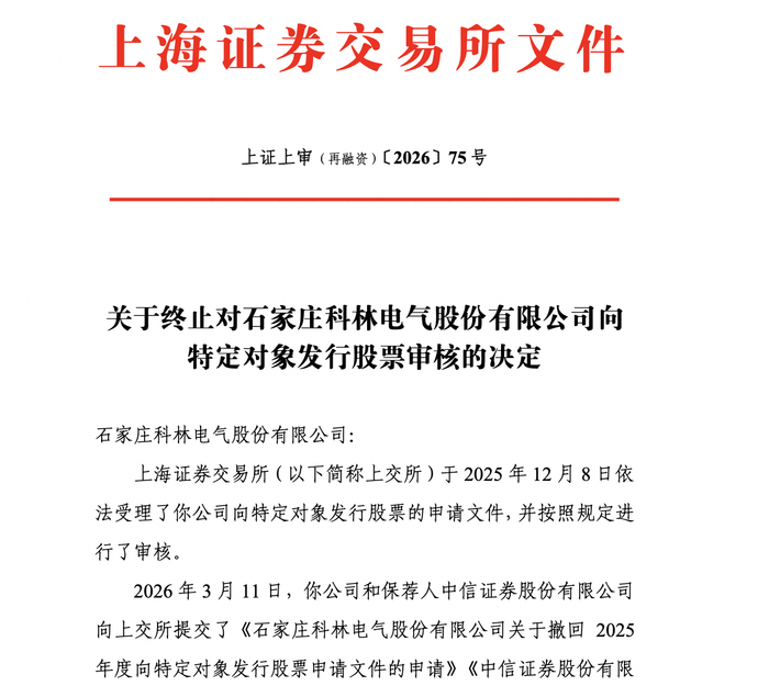 瑞财经 刘治颖3月16日,上交所发布关于终止对石家庄科林电气股份有限公司(以下简称:科林电气)向特定对象发行股票审核的决定。