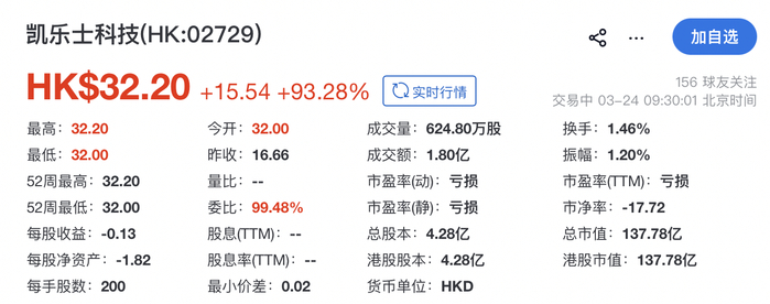 瑞财经 吴文婷 3月24日,凯乐士科技(02729.HK)在港交所挂牌上市,国泰君安国际、中信证券联席保荐。其开盘报32.2港元,涨93.28%,总市值约137.78亿港元。